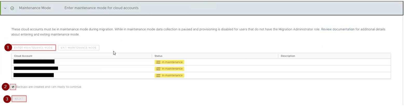 3. Maintenance Mode-Now we are on that next step which will take the vRA account into MM. Here we click on Enter Maintenance Mode. Prior that we must assure, we have taken the backup of the vRA and then hit enter maintenance mode and click Backups are created and I am ready to continue, then click Next to move to next page of migration plan.
