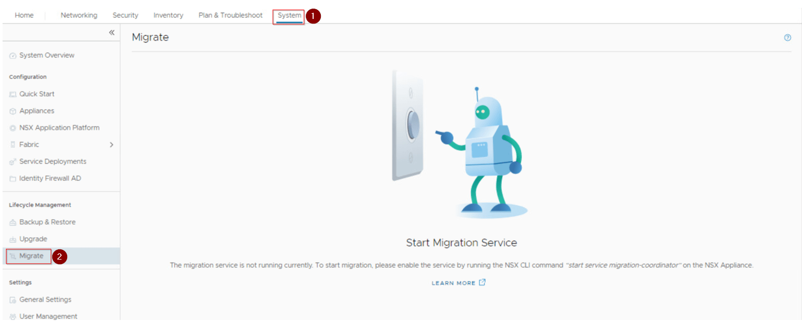 1: Login to the NSX-T via GUI, click on System and navigate to Migrate on left side panel and click on it. We observe that the Migration coordinator service is not enabled.