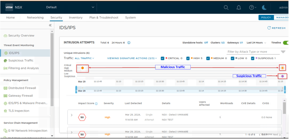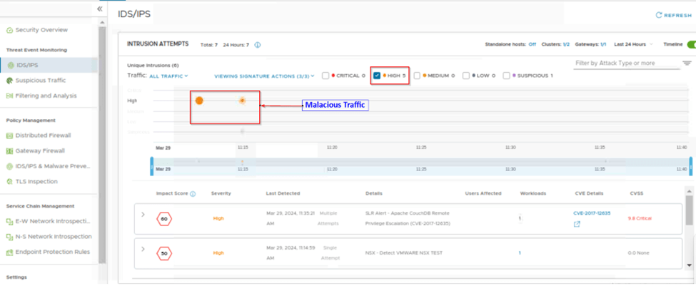We setup the IDS/IPS on one of the cluster, created the profiles and configured the distributed rule for intrusion detection by selecting detect only mode, later we analyzed the traffic and then changed the same rule mode to detect and prevent and analyzed the traffic and compared the difference of Intrusion detect and intrusion detection/prevention.