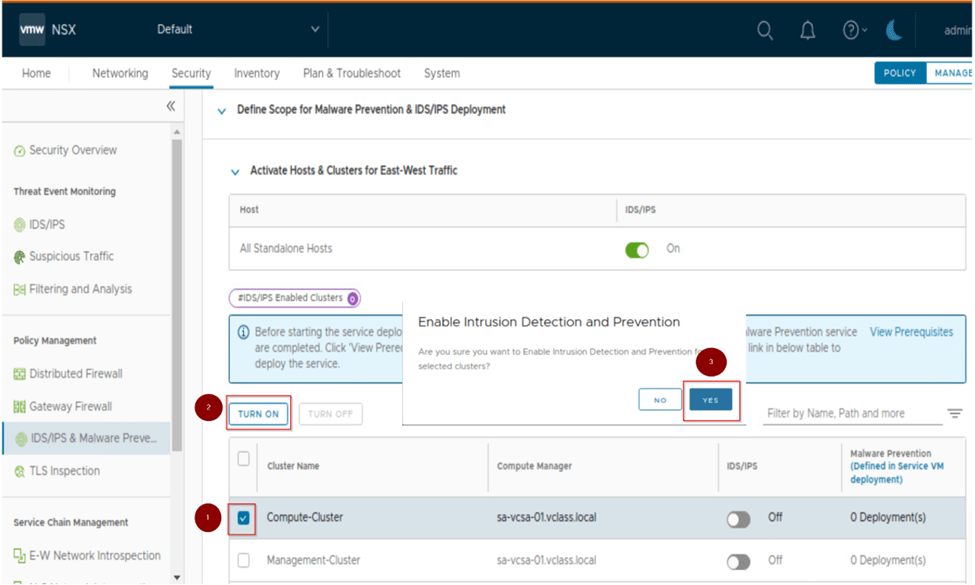 Once we have hit yes we scroll down on the same page and select the cluster on which we want to enable IDS/IPS. Here we are enabling it on the compute cluster by selecting it and clicking on turn on.