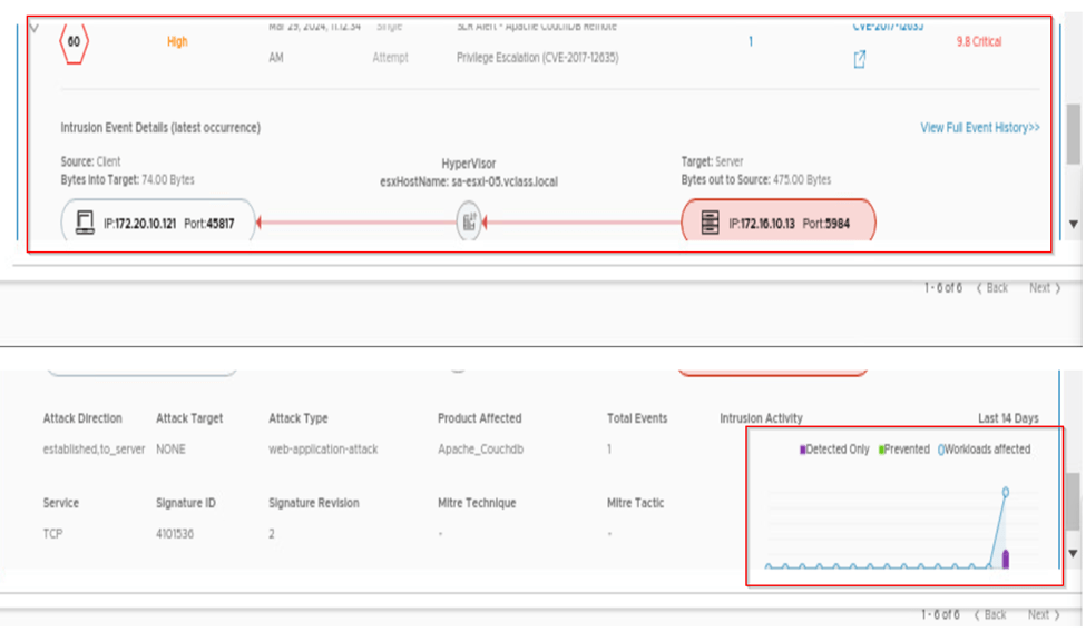 Once we verify it we are all set and see if any malicious traffic comes it will be detected and prevented as well. Here in back end we have generated the malicious and suspicious traffic from rogue PC and on NSX we can see the events under the threat event monitoring. Below are the captures for your references which shows the detected and prevented attacks from the rogue PC.