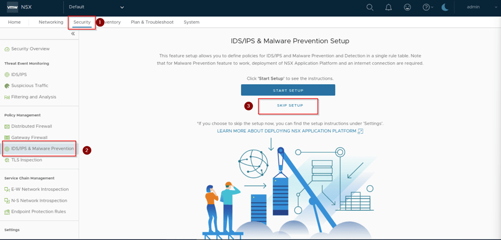 Login into NSX and navigate to Security –> Policy Management–>IDS/IPS & Malware Prevention.