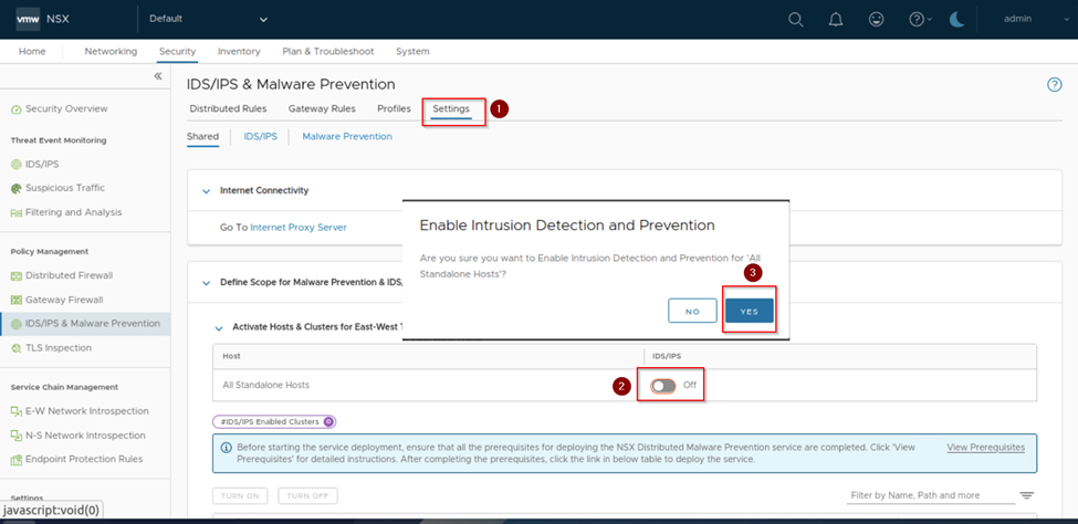 As per above capture in our case we will skip the setup and proceed further. We click on settings on same window and enable the IDP/IPS on All standalone hosts and click yes.