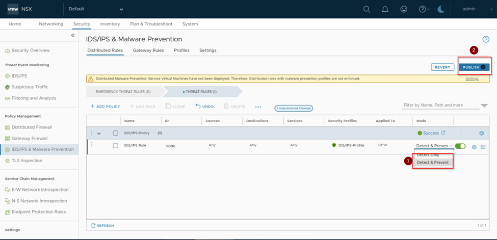 Login into NSX and navigate to Security –> Policy Management–>IDS/IPS & Malware Prevention.