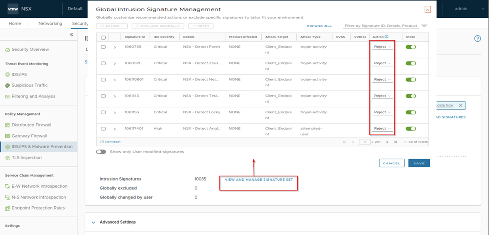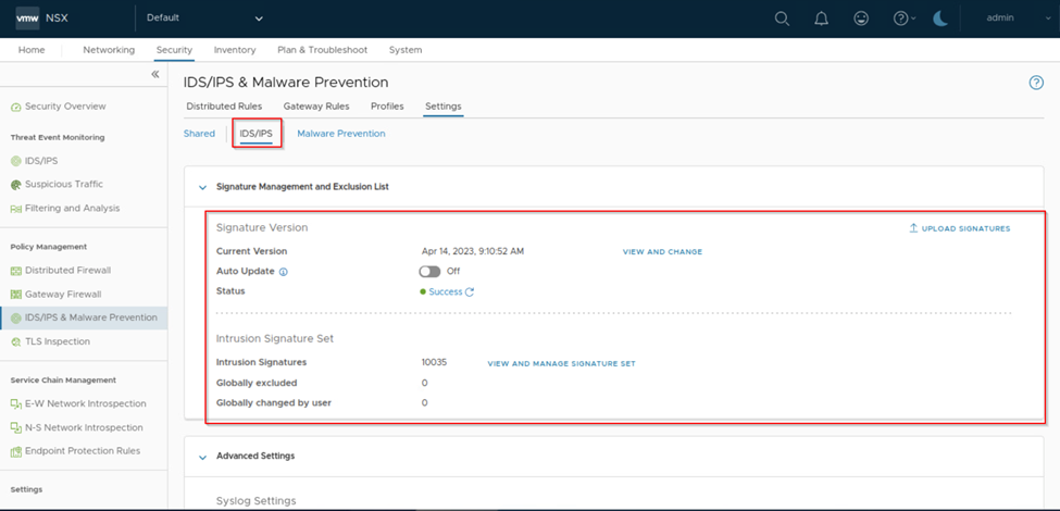 Once we have enabled the IDS/IPS on required cluster we scroll up and select IDS/IPS. We can see that the Signature version status is success. We can observe intrusion signatures set under it there is the number of signatures 10035 which we can view and manage. If any signature is available, we can upload signatures or we get notified if any new signatures available to update.