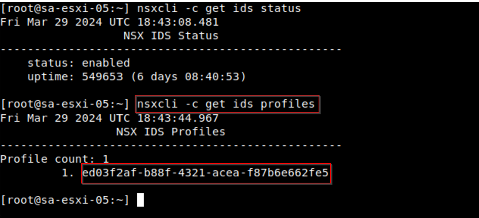 Now let’s check the profile what we have created is been reflected on the ESXi.Provide the command “nsxcli -c get ids profiles”. This command will provide the UUID of the profile.