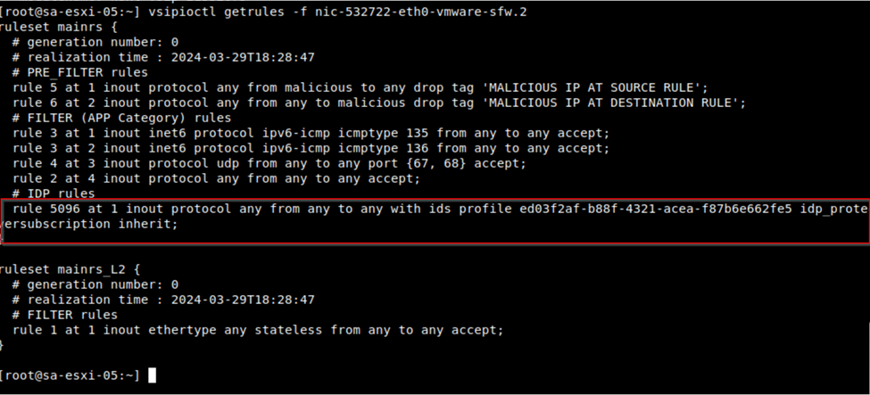 Later we went through the CLI of ESXi and checked the configuration of IDS/IPS on it and verified VMs running on that cluster which are enabled for IDS/IPS. How do we check the rules/profiles for specific VMs.