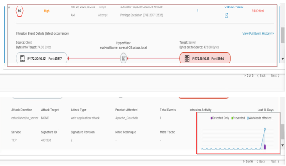 Once we verify it we are all set and see if any malicious traffic comes it will be detected and prevented as well. Here in back end we have generated the malicious and suspicious traffic from rogue PC and on NSX we can see the events under the threat event monitoring. Below are the captures for your references which shows the detected and prevented attacks from the rogue PC.